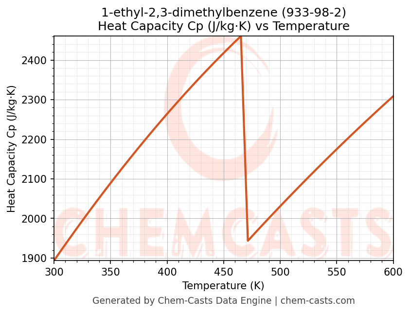 - Specific heat capacity (Cp) indicates the amount of energy required to raise the temperature of 1-ethyl-2,3-dimethylbenzene and is critical for energy balance and heat-exchanger design.