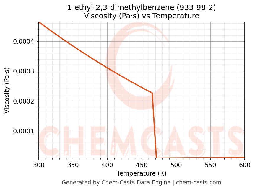 This page presents the temperature-dependent thermodynamic and transport properties of 1-ethyl-2,3-dimethylbenzene (CAS 933-98-2) calculated at a constant pressure of 1 atm (101325 Pa) over the temperature range 250-500 K.