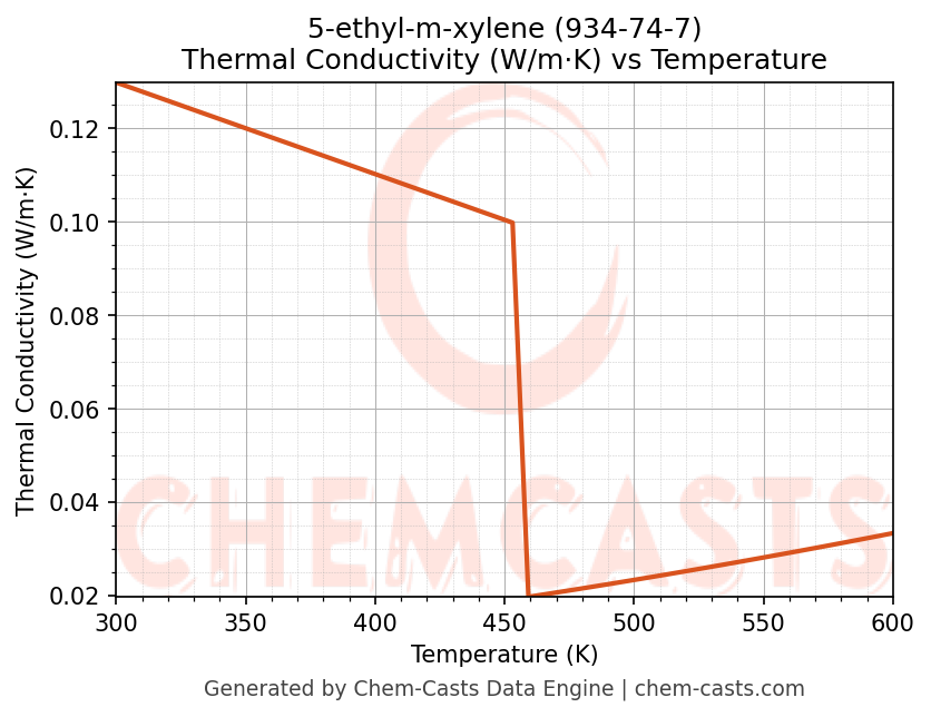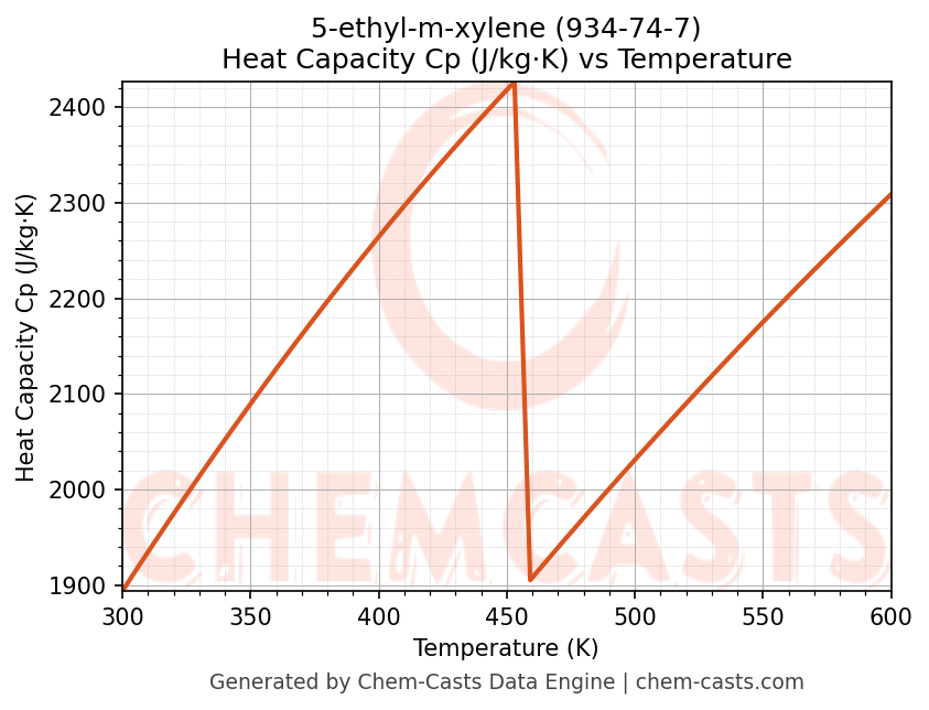 - Specific heat capacity (Cp) indicates the amount of energy required to raise the temperature of 5-ethyl-m-xylene and is critical for energy balance and heat-exchanger design.