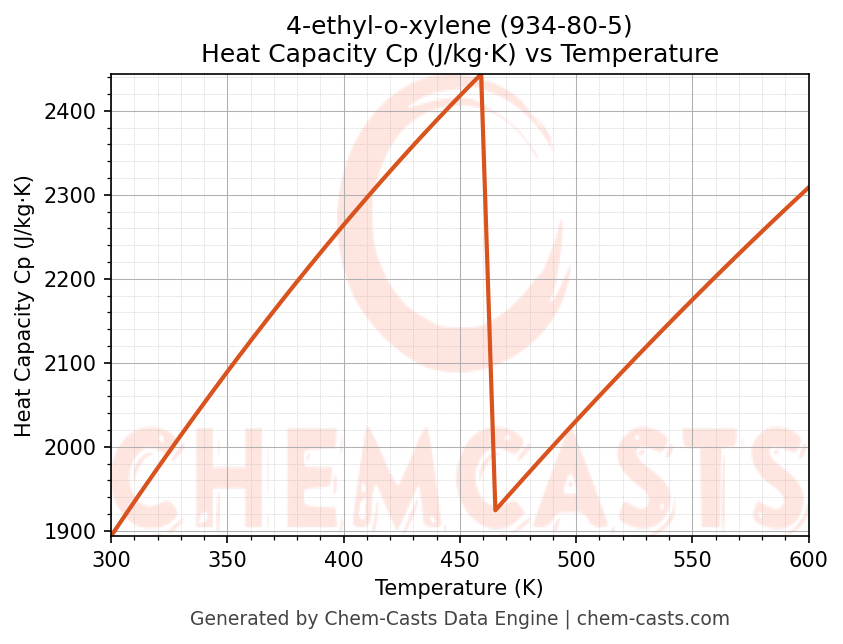 - Specific heat capacity (Cp) indicates the amount of energy required to raise the temperature of 4-ethyl-o-xylene and is critical for energy balance and heat-exchanger design.