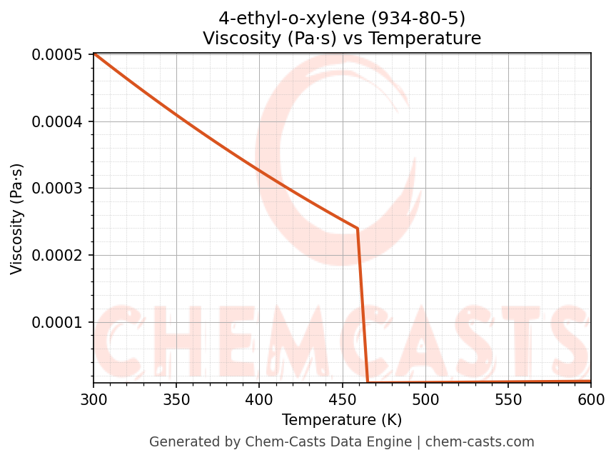 This page presents the temperature-dependent thermodynamic and transport properties of 4-ethyl-o-xylene (CAS 934-80-5) calculated at a constant pressure of 1 atm (101325 Pa) over the temperature range 250-500 K.