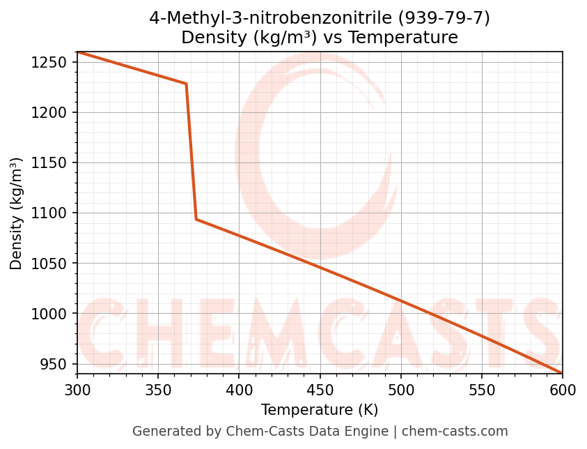 This page presents the temperature-dependent thermodynamic and transport properties of 4-Methyl-3-nitrobenzonitrile (CAS 939-79-7) calculated at a constant pressure of 1 atm (101325 Pa) over the temperature range 250-500 K.