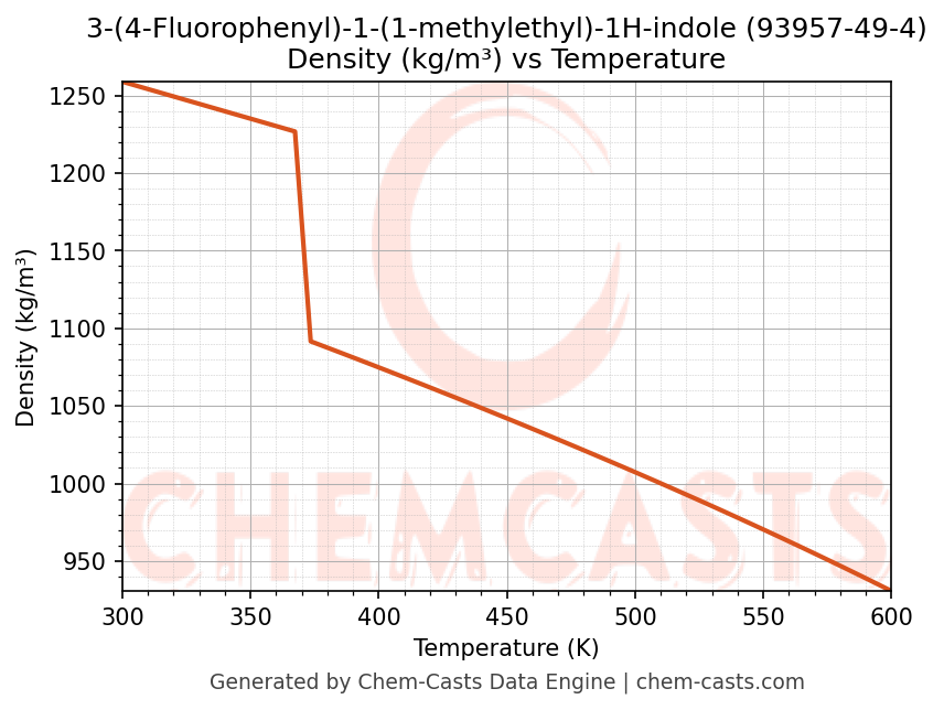 This page presents the temperature-dependent thermodynamic and transport properties of 3-(4-Fluorophenyl)-1-(1-methylethyl)-1H-indole (CAS 93957-49-4) calculated at a constant pressure of 1 atm (101325 Pa) over the temperature range 250-500 K.