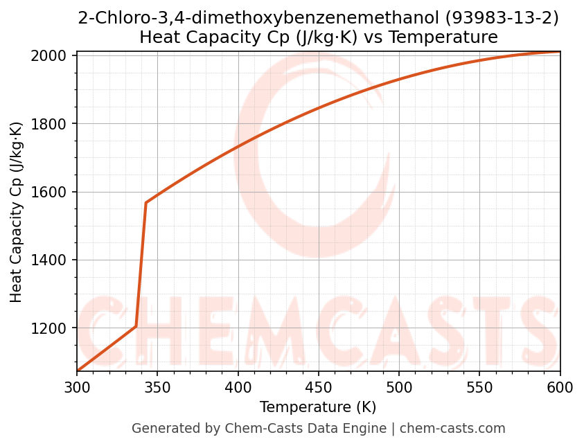 - Specific heat capacity (Cp) indicates the amount of energy required to raise the temperature of 2-Chloro-3,4-dimethoxybenzenemethanol and is critical for energy balance and heat-exchanger design.