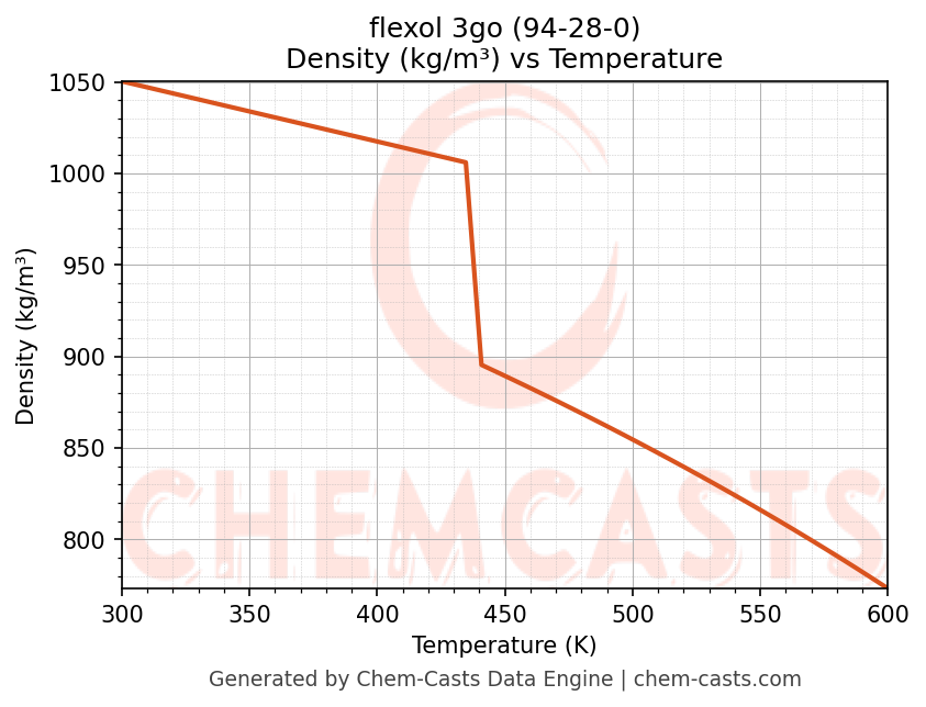 This page presents the temperature-dependent thermodynamic and transport properties of flexol 3go (CAS 94-28-0) calculated at a constant pressure of 1 atm (101325 Pa) over the temperature range 250-500 K.
