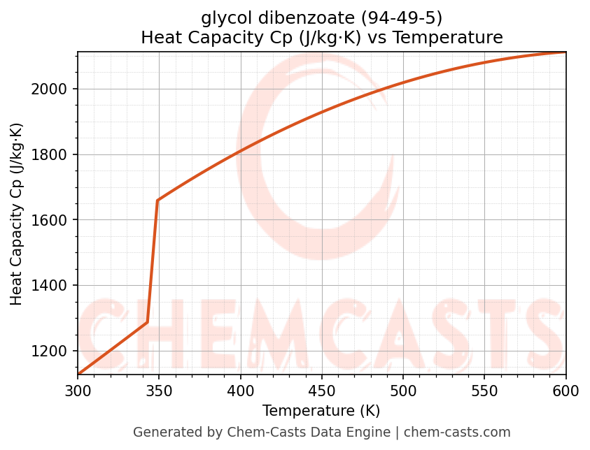 - Specific heat capacity (Cp) indicates the amount of energy required to raise the temperature of glycol dibenzoate and is critical for energy balance and heat-exchanger design.