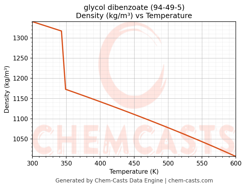 This page presents the temperature-dependent thermodynamic and transport properties of glycol dibenzoate (CAS 94-49-5) calculated at a constant pressure of 1 atm (101325 Pa) over the temperature range 250-500 K.