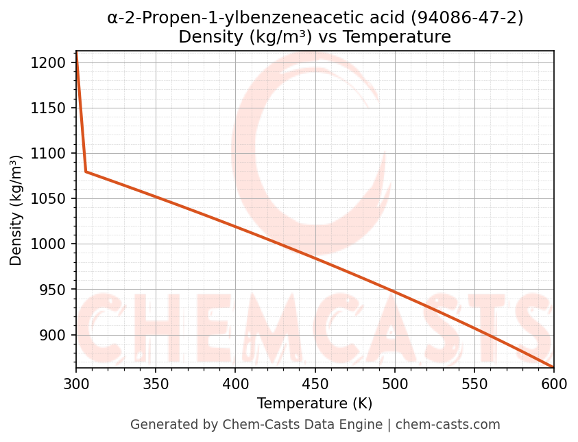 This page presents the temperature-dependent thermodynamic and transport properties of α-2-Propen-1-ylbenzeneacetic acid (CAS 94086-47-2) calculated at a constant pressure of 1 atm (101325 Pa) over the temperature range 250-500 K.