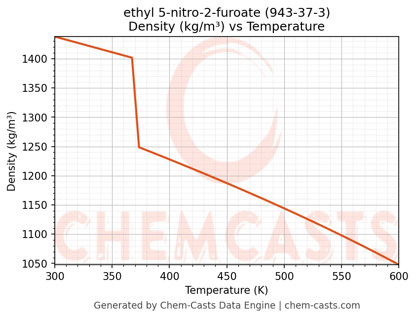 This page presents the temperature-dependent thermodynamic and transport properties of ethyl 5-nitro-2-furoate (CAS 943-37-3) calculated at a constant pressure of 1 atm (101325 Pa) over the temperature range 250-500 K.