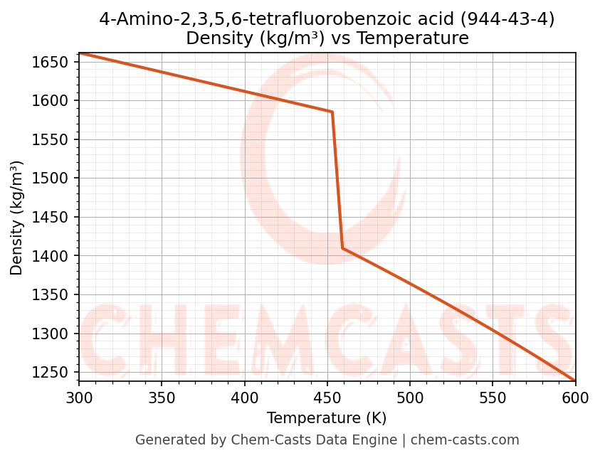 This page presents the temperature-dependent thermodynamic and transport properties of 4-Amino-2,3,5,6-tetrafluorobenzoic acid (CAS 944-43-4) calculated at a constant pressure of 1 atm (101325 Pa) over the temperature range 250-500 K.