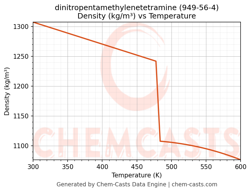 This page presents the temperature-dependent thermodynamic and transport properties of dinitropentamethylenetetramine (CAS 949-56-4) calculated at a constant pressure of 1 atm (101325 Pa) over the temperature range 250-500 K.