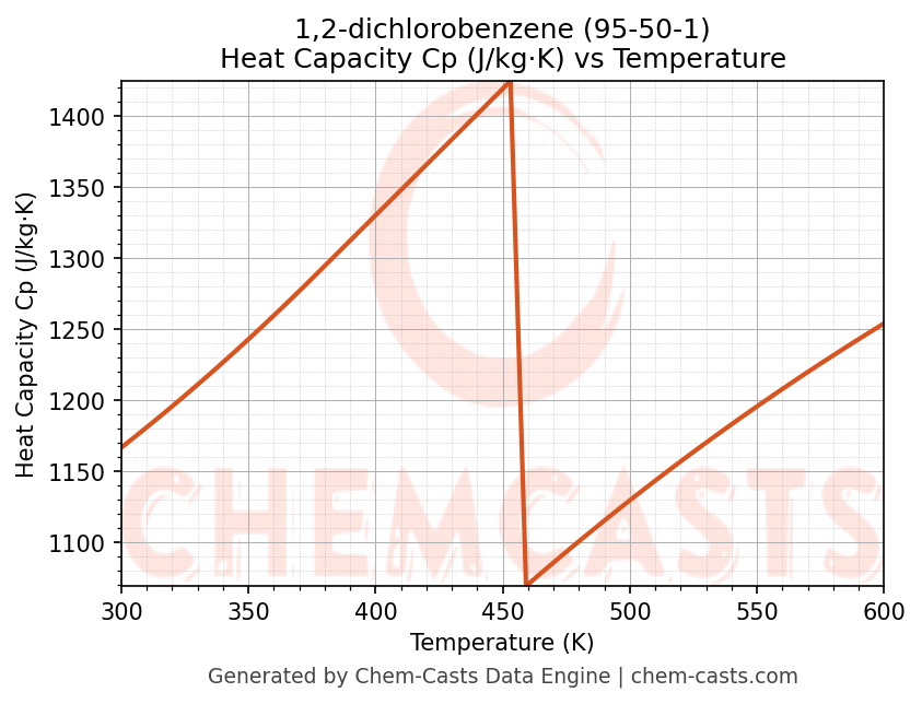 - Specific heat capacity (Cp) indicates the amount of energy required to raise the temperature of 1,2-dichlorobenzene and is critical for energy balance and heat-exchanger design.