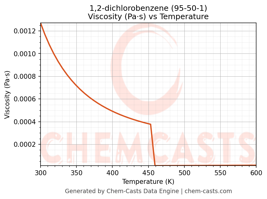 This page presents the temperature-dependent thermodynamic and transport properties of 1,2-dichlorobenzene (CAS 95-50-1) calculated at a constant pressure of 1 atm (101325 Pa) over the temperature range 250-500 K.