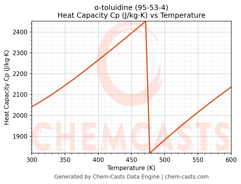 - Specific heat capacity (Cp) indicates the amount of energy required to raise the temperature of o-toluidine and is critical for energy balance and heat-exchanger design.