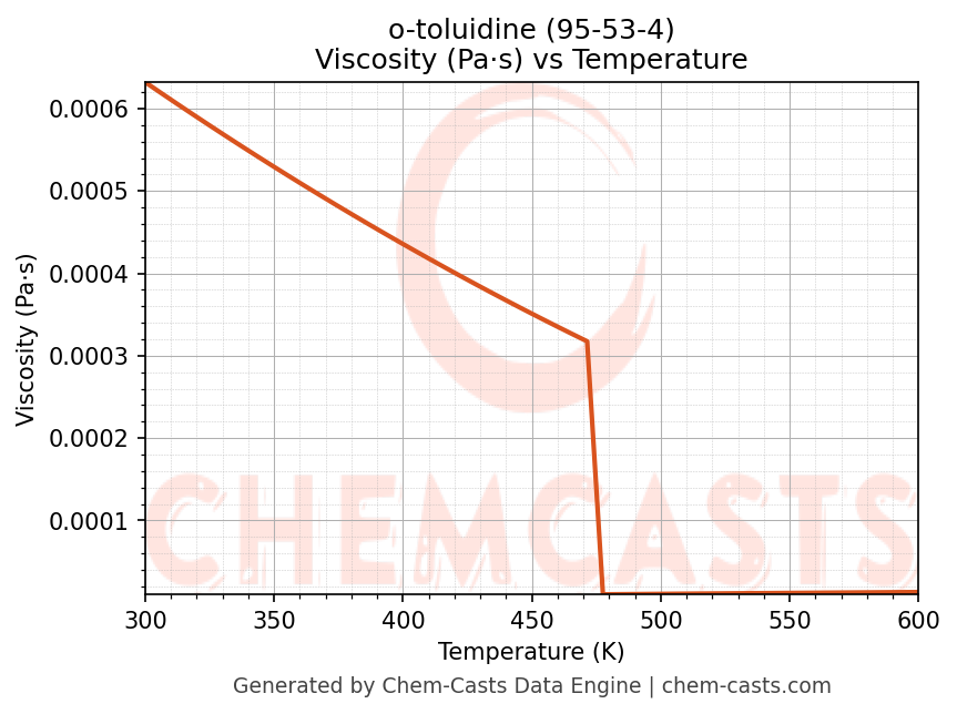 This page presents the temperature-dependent thermodynamic and transport properties of o-toluidine (CAS 95-53-4) calculated at a constant pressure of 1 atm (101325 Pa) over the temperature range 250-500 K.