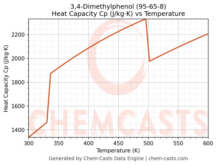 - Specific heat capacity (Cp) indicates the amount of energy required to raise the temperature of 3,4-Dimethylphenol and is critical for energy balance and heat-exchanger design.