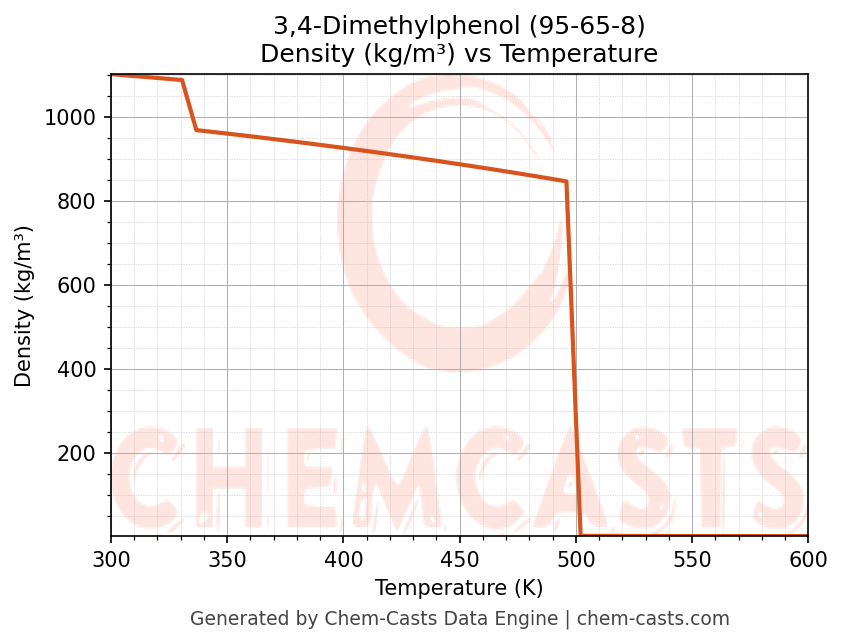 This page presents the temperature-dependent thermodynamic and transport properties of 3,4-Dimethylphenol (CAS 95-65-8) calculated at a constant pressure of 1 atm (101325 Pa) over the temperature range 250-500 K.