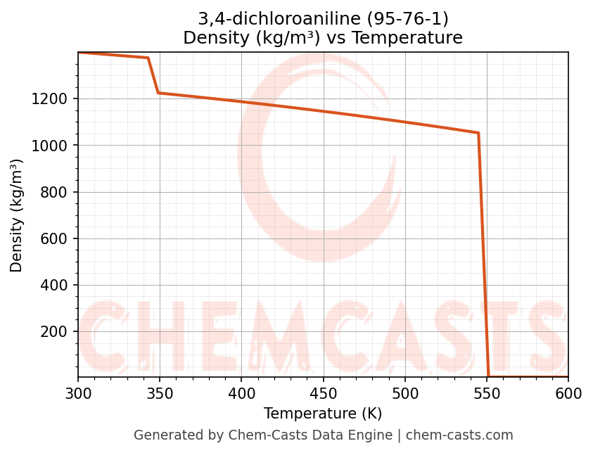 This page presents the temperature-dependent thermodynamic and transport properties of 3,4-dichloroaniline (CAS 95-76-1) calculated at a constant pressure of 1 atm (101325 Pa) over the temperature range 250-500 K.