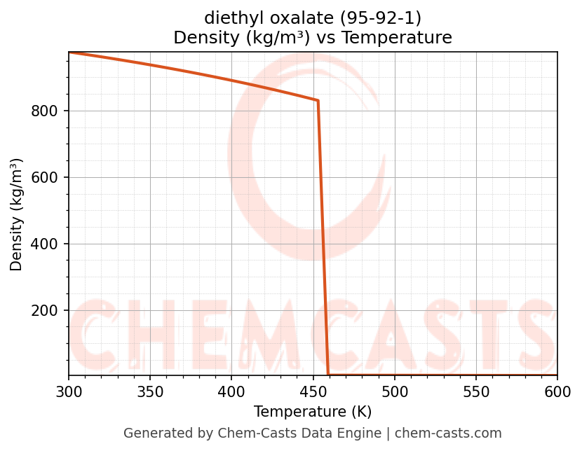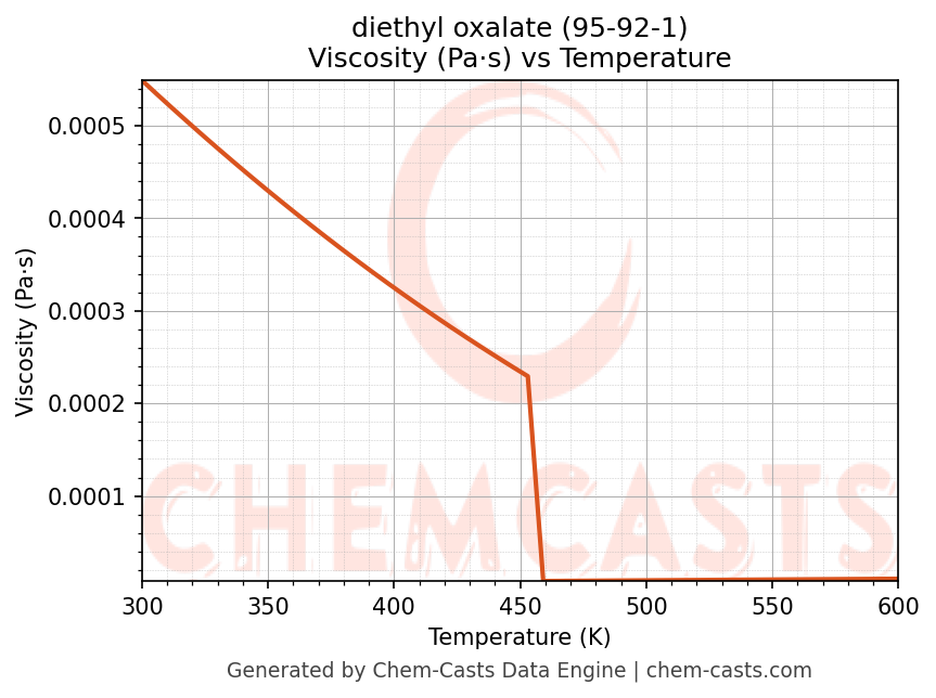 This page presents the temperature-dependent thermodynamic and transport properties of diethyl oxalate (CAS 95-92-1) calculated at a constant pressure of 1 atm (101325 Pa) over the temperature range 250-500 K.