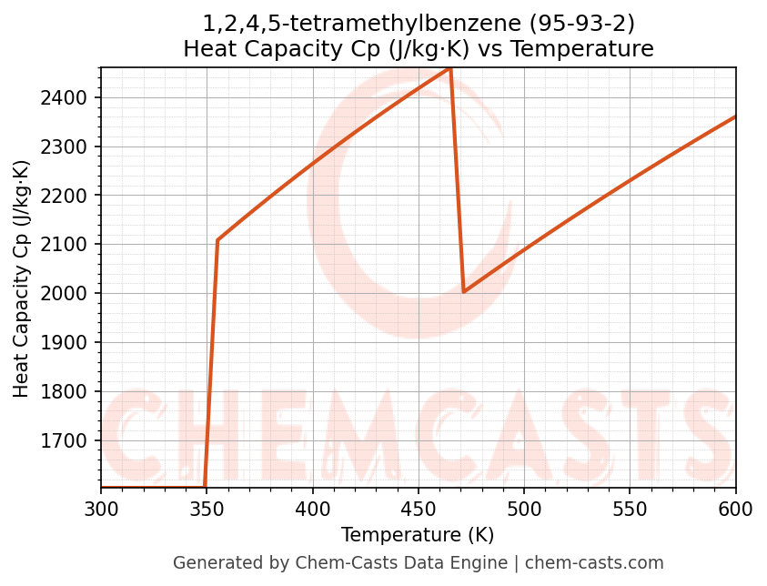- Specific heat capacity (Cp) indicates the amount of energy required to raise the temperature of 1,2,4,5-tetramethylbenzene and is critical for energy balance and heat-exchanger design.