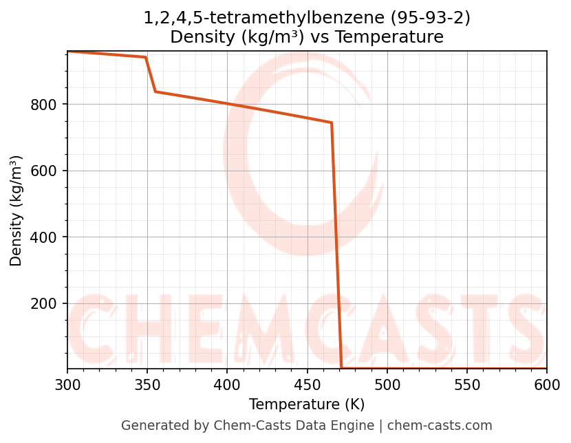 This page presents the temperature-dependent thermodynamic and transport properties of 1,2,4,5-tetramethylbenzene (CAS 95-93-2) calculated at a constant pressure of 1 atm (101325 Pa) over the temperature range 250-500 K.
