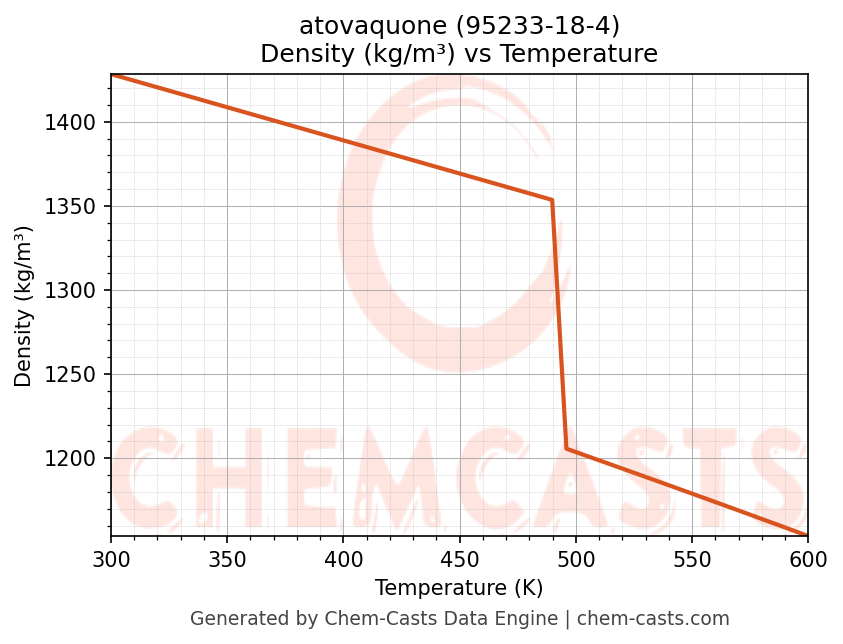 This page presents the temperature-dependent thermodynamic and transport properties of atovaquone (CAS 95233-18-4) calculated at a constant pressure of 1 atm (101325 Pa) over the temperature range 250-500 K.