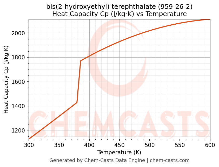 - Specific heat capacity (Cp) indicates the amount of energy required to raise the temperature of bis(2-hydroxyethyl) terephthalate and is critical for energy balance and heat-exchanger design.