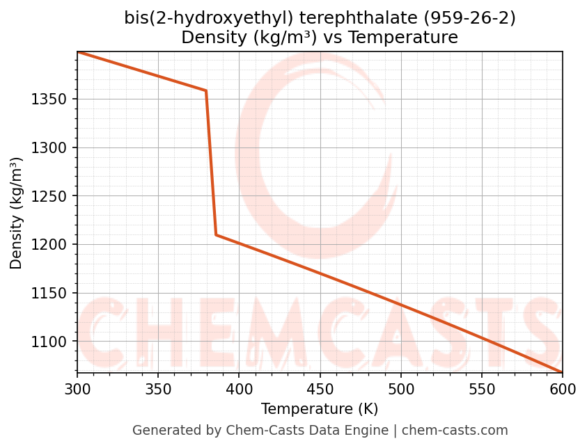 This page presents the temperature-dependent thermodynamic and transport properties of bis(2-hydroxyethyl) terephthalate (CAS 959-26-2) calculated at a constant pressure of 1 atm (101325 Pa) over the temperature range 250-500 K.