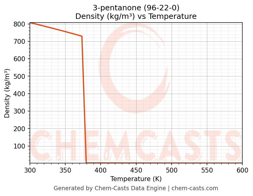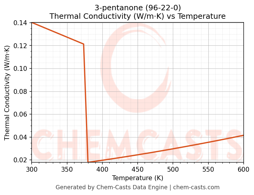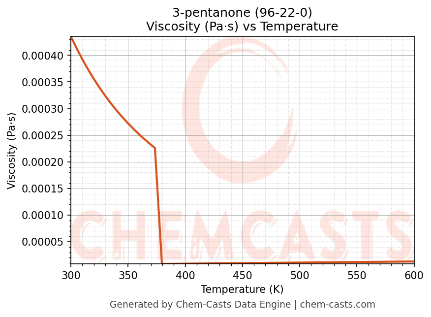 This page presents the temperature-dependent thermodynamic and transport properties of 3-pentanone (CAS 96-22-0) calculated at a constant pressure of 1 atm (101325 Pa) over the temperature range 250-500 K.