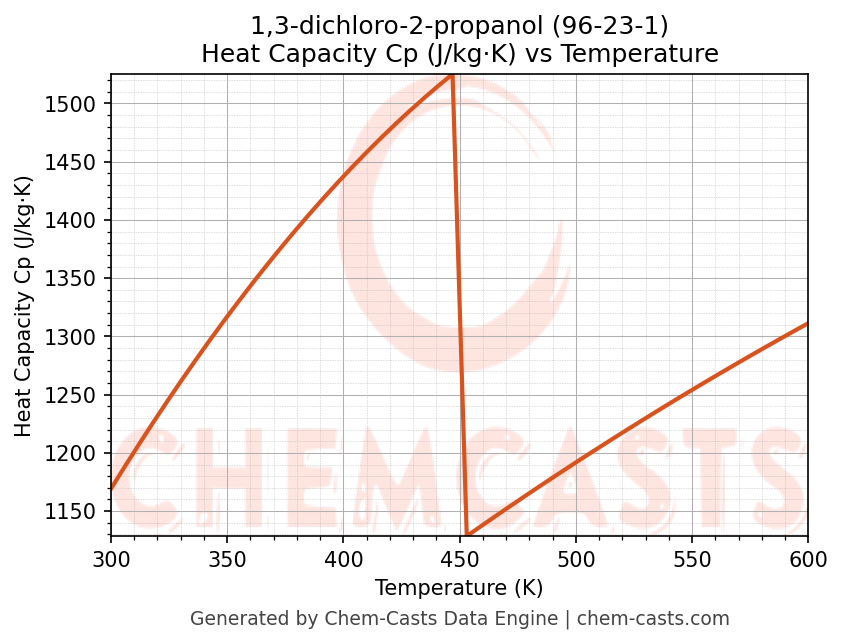 - Specific heat capacity (Cp) indicates the amount of energy required to raise the temperature of 1,3-dichloro-2-propanol and is critical for energy balance and heat-exchanger design.