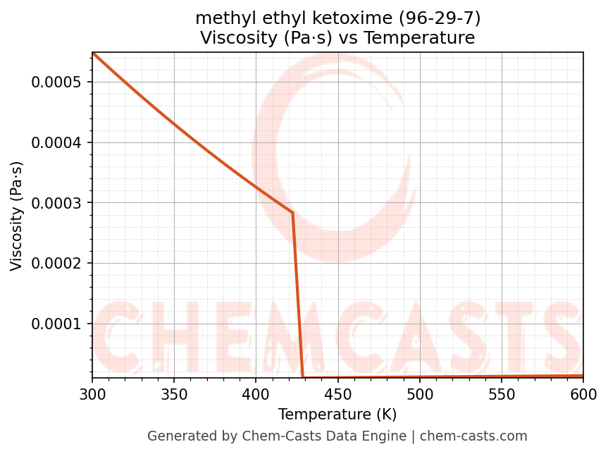 This page presents the temperature-dependent thermodynamic and transport properties of methyl ethyl ketoxime (CAS 96-29-7) calculated at a constant pressure of 1 atm (101325 Pa) over the temperature range 250-500 K.