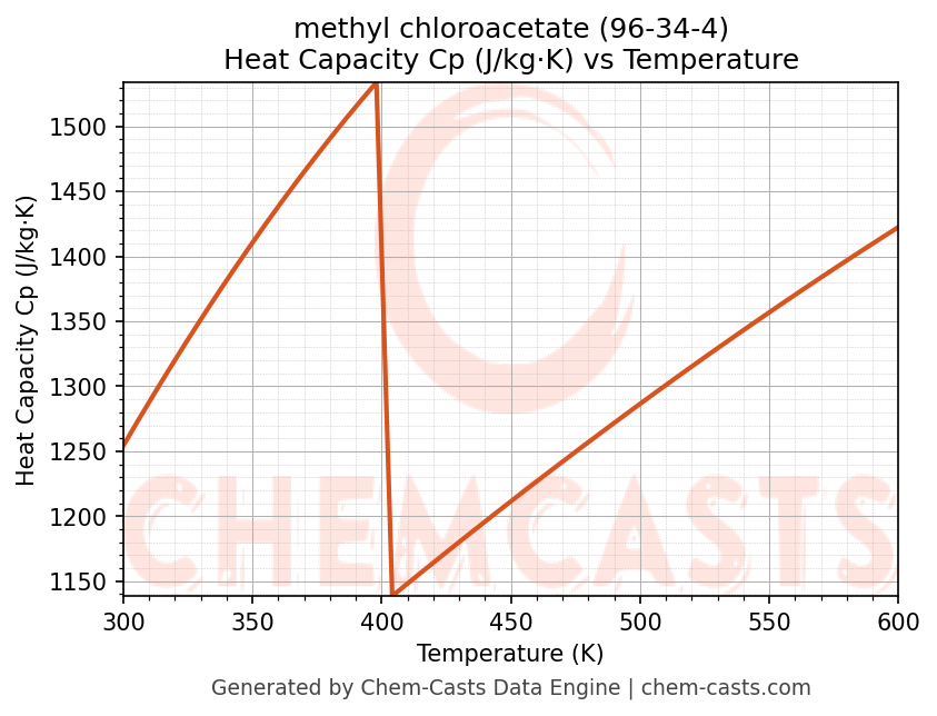 - Specific heat capacity (Cp) indicates the amount of energy required to raise the temperature of methyl chloroacetate and is critical for energy balance and heat-exchanger design.