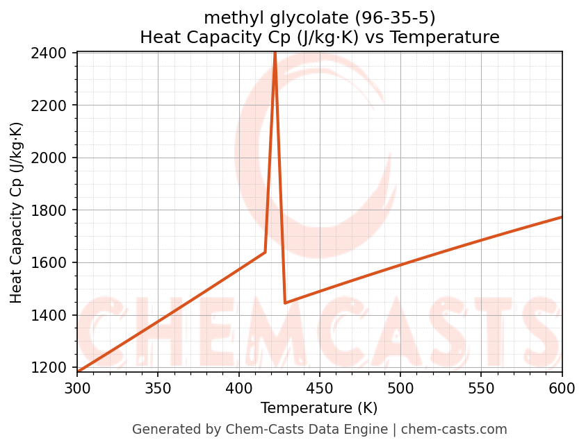 - Specific heat capacity (Cp) indicates the amount of energy required to raise the temperature of methyl glycolate and is critical for energy balance and heat-exchanger design.