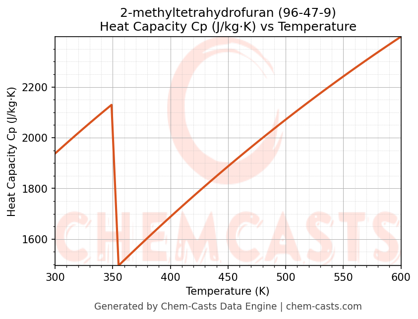- Specific heat capacity (Cp) indicates the amount of energy required to raise the temperature of 2-methyltetrahydrofuran and is critical for energy balance and heat-exchanger design.