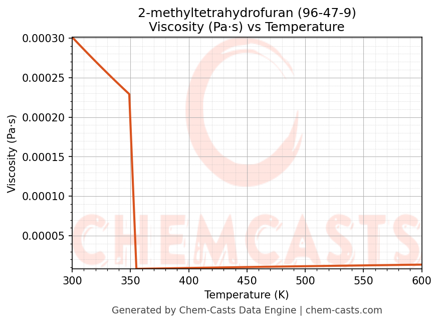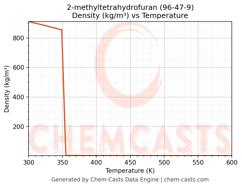 This page presents the temperature-dependent thermodynamic and transport properties of 2-methyltetrahydrofuran (CAS 96-47-9) calculated at a constant pressure of 1 atm (101325 Pa) over the temperature range 250-500 K.