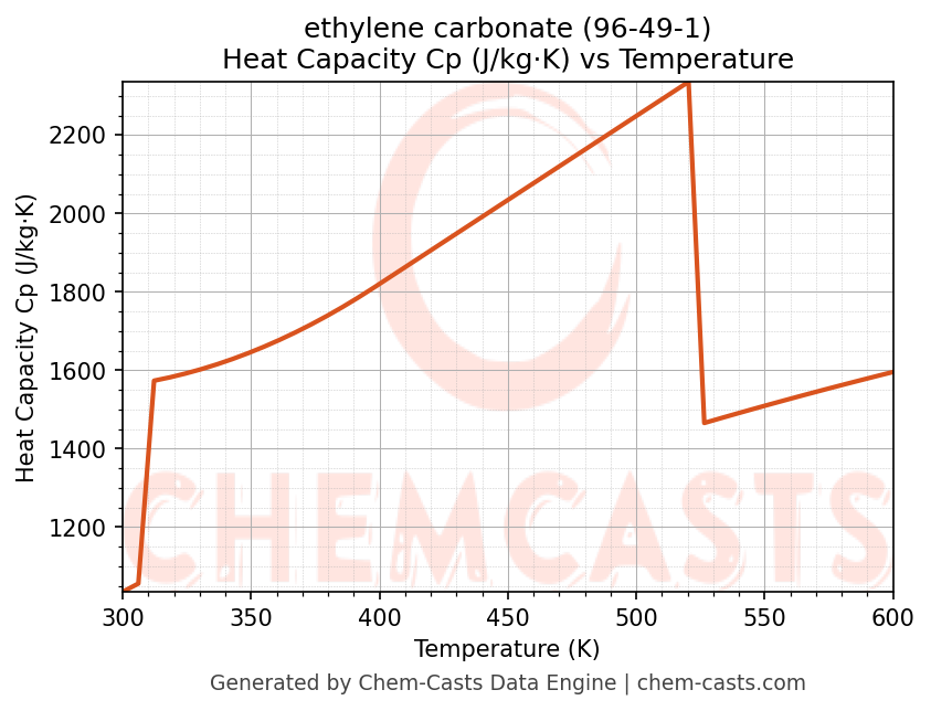 - Specific heat capacity (Cp) indicates the amount of energy required to raise the temperature of ethylene carbonate and is critical for energy balance and heat-exchanger design.