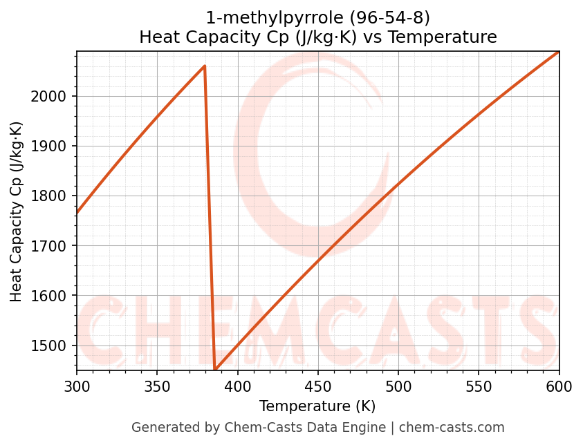 - Specific heat capacity (Cp) indicates the amount of energy required to raise the temperature of 1-methylpyrrole and is critical for energy balance and heat-exchanger design.