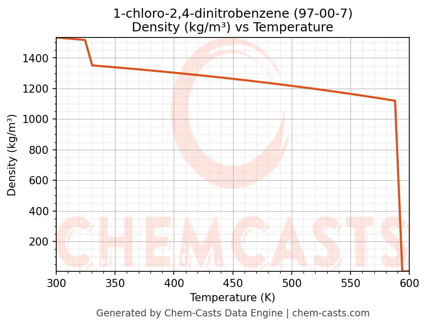 This page presents the temperature-dependent thermodynamic and transport properties of 1-chloro-2,4-dinitrobenzene (CAS 97-00-7) calculated at a constant pressure of 1 atm (101325 Pa) over the temperature range 250-500 K.