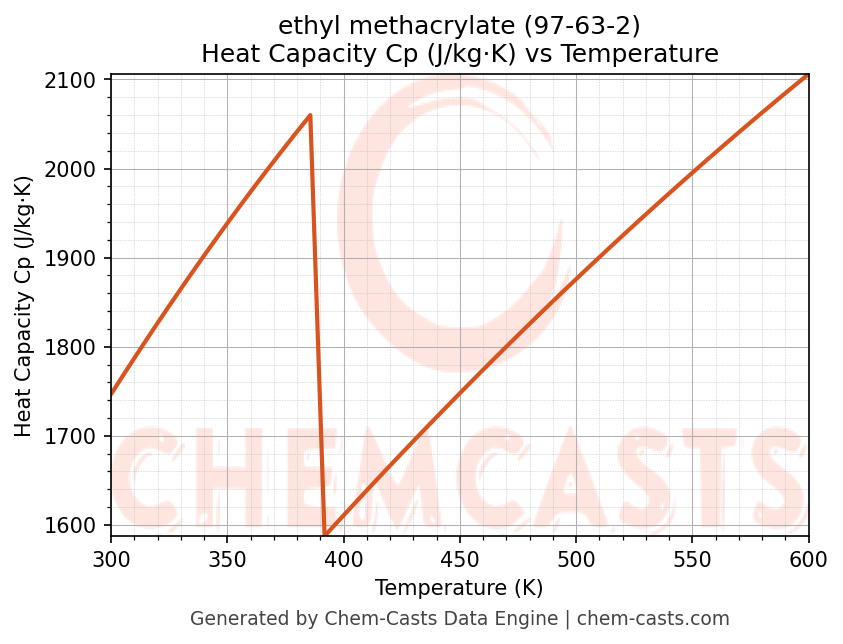 - Specific heat capacity (Cp) indicates the amount of energy required to raise the temperature of ethyl methacrylate and is critical for energy balance and heat-exchanger design.