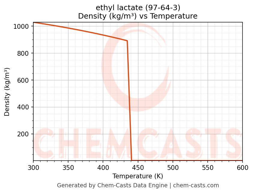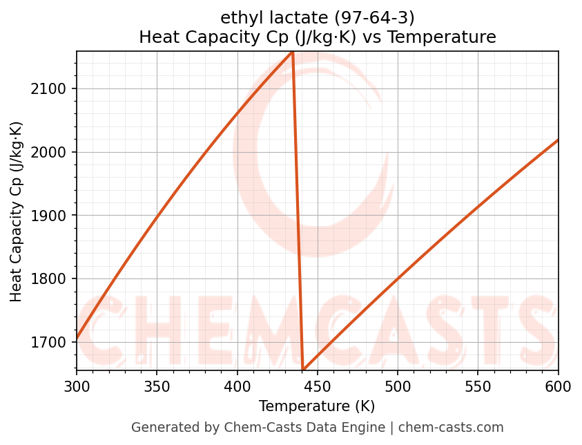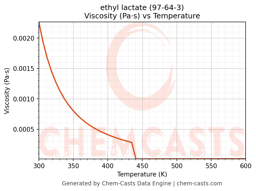 This page presents the temperature-dependent thermodynamic and transport properties of ethyl lactate (CAS 97-64-3) calculated at a constant pressure of 1 atm (101325 Pa) over the temperature range 250-500 K.