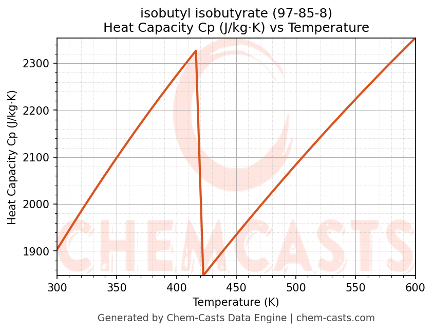 - Specific heat capacity (Cp) indicates the amount of energy required to raise the temperature of isobutyl isobutyrate and is critical for energy balance and heat-exchanger design.