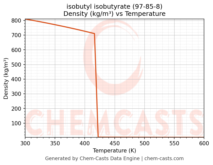 This page presents the temperature-dependent thermodynamic and transport properties of isobutyl isobutyrate (CAS 97-85-8) calculated at a constant pressure of 1 atm (101325 Pa) over the temperature range 250-500 K.