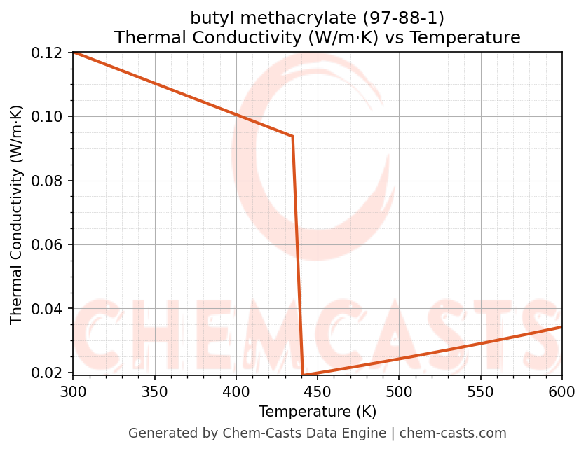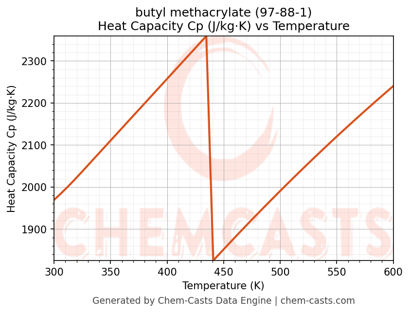- Specific heat capacity (Cp) indicates the amount of energy required to raise the temperature of butyl methacrylate and is critical for energy balance and heat-exchanger design.