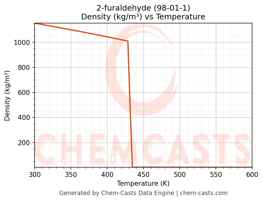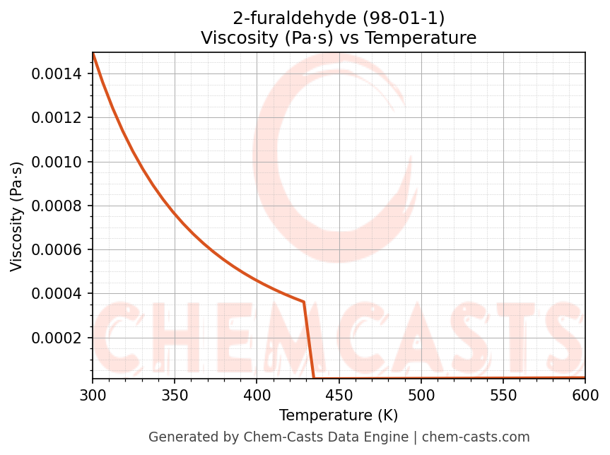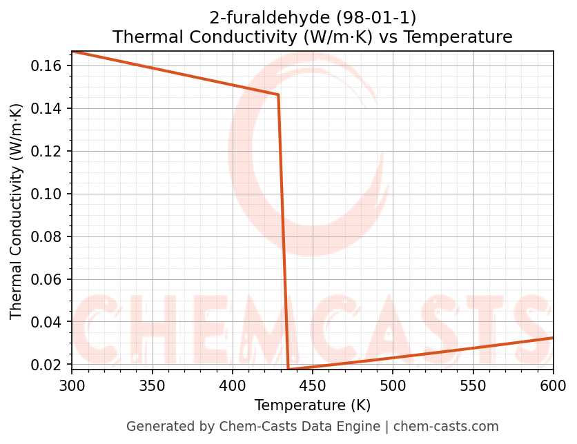 This page presents the temperature-dependent thermodynamic and transport properties of 2-furaldehyde (CAS 98-01-1) calculated at a constant pressure of 1 atm (101325 Pa) over the temperature range 250-500 K.
