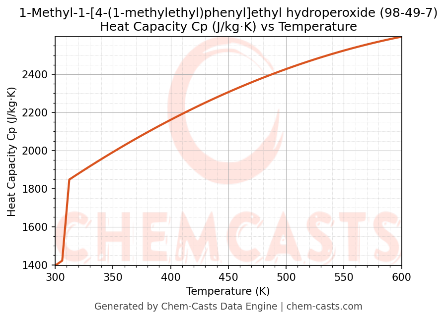 ![Heat Capacity (Cp) vs Temperature chart for 1-Methyl-1-[4-(1-methylethyl)phenyl]ethyl hydroperoxide (CAS 98-49-7)](https://chemcasts-prod.s3.ap-south-1.amazonaws.com/chem_plots_pconst/98-49-7-cp.png)