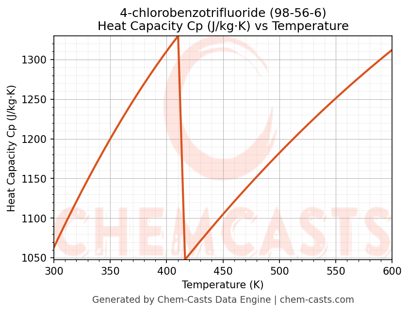 - Specific heat capacity (Cp) indicates the amount of energy required to raise the temperature of 4-chlorobenzotrifluoride and is critical for energy balance and heat-exchanger design.