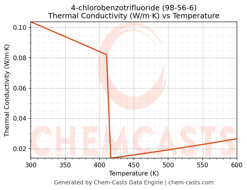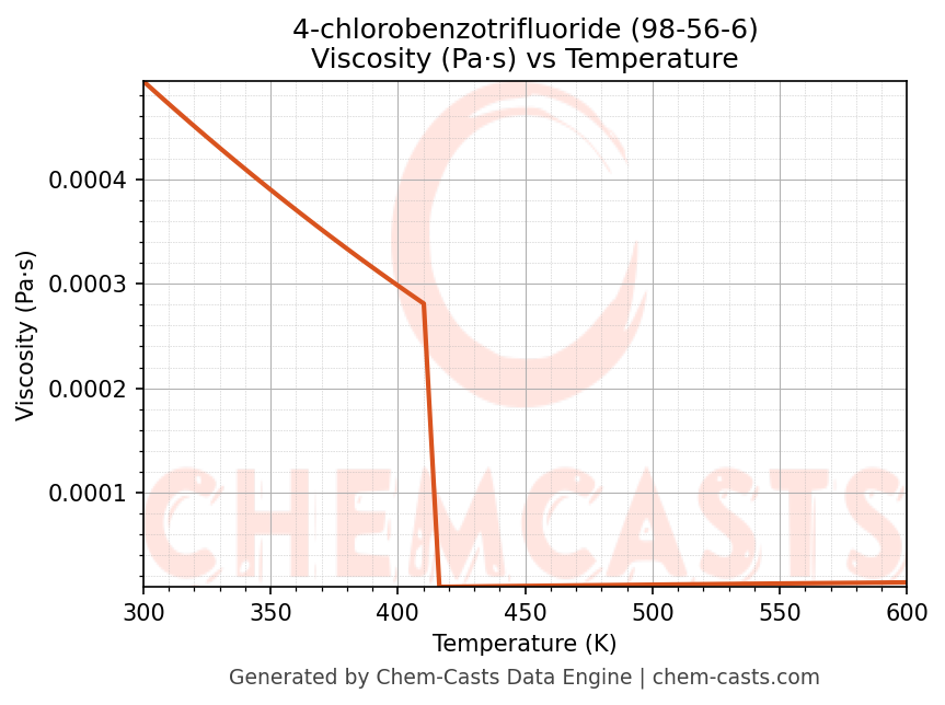 This page presents the temperature-dependent thermodynamic and transport properties of 4-chlorobenzotrifluoride (CAS 98-56-6) calculated at a constant pressure of 1 atm (101325 Pa) over the temperature range 250-500 K.