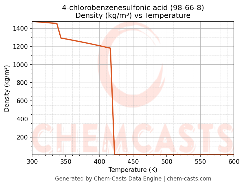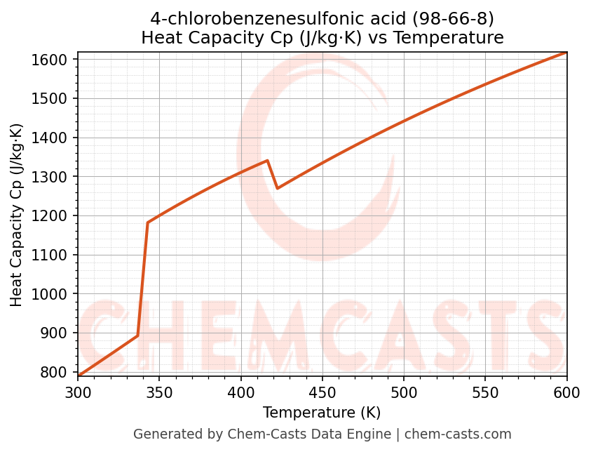 - Specific heat capacity (Cp) indicates the amount of energy required to raise the temperature of 4-chlorobenzenesulfonic acid and is critical for energy balance and heat-exchanger design.