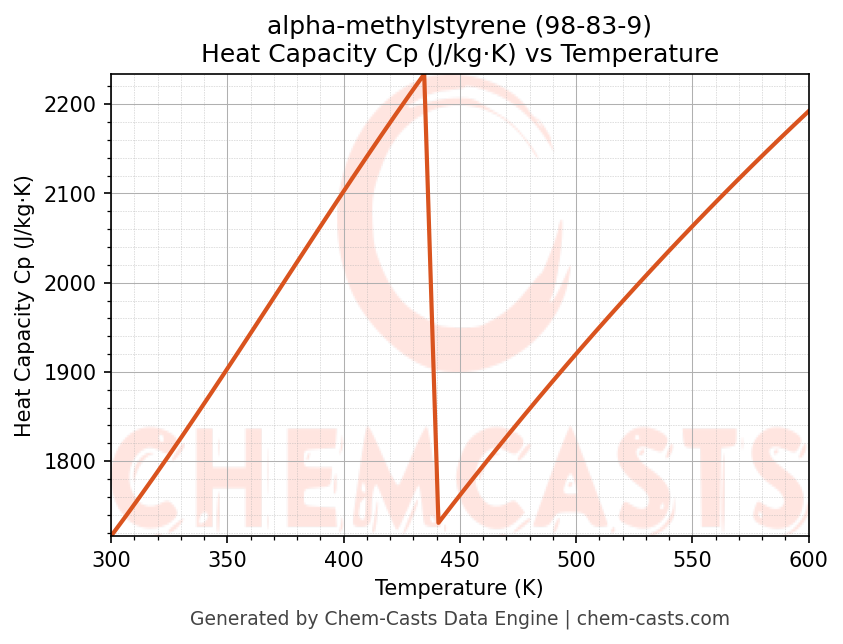 - Specific heat capacity (Cp) indicates the amount of energy required to raise the temperature of alpha-methylstyrene and is critical for energy balance and heat-exchanger design.
