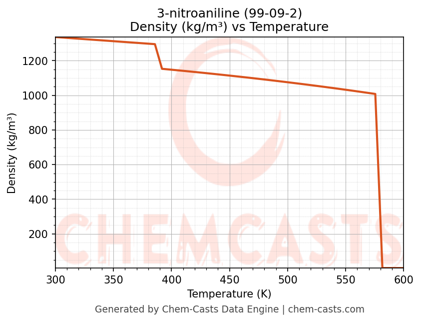 This page presents the temperature-dependent thermodynamic and transport properties of 3-nitroaniline (CAS 99-09-2) calculated at a constant pressure of 1 atm (101325 Pa) over the temperature range 250-500 K.